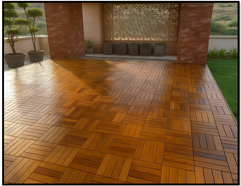 Solid wood deck tiles are pre-assembled square or rectangular panels made from durable solid wood, designed for easy installation on outdoor or indoor surfaces. These tiles are used to create decking areas without the need for extensive construction.